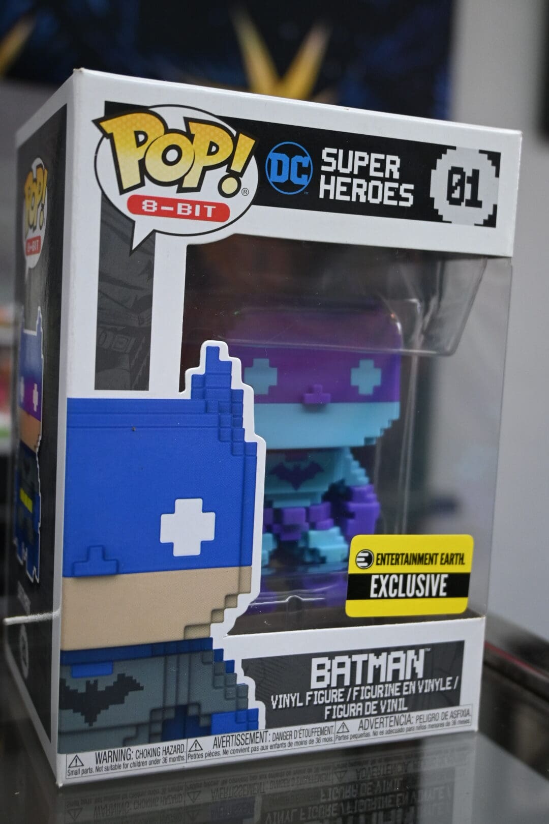 This Entertainment Earth Exclusive features 8-Bit Batman in a vibrant blue, purple, and teal pixelated design inspired by retro video games. The blocky 8-bit sculpt gives this Pop a nostalgic arcade feel, making it stand out from traditional Batman figures.