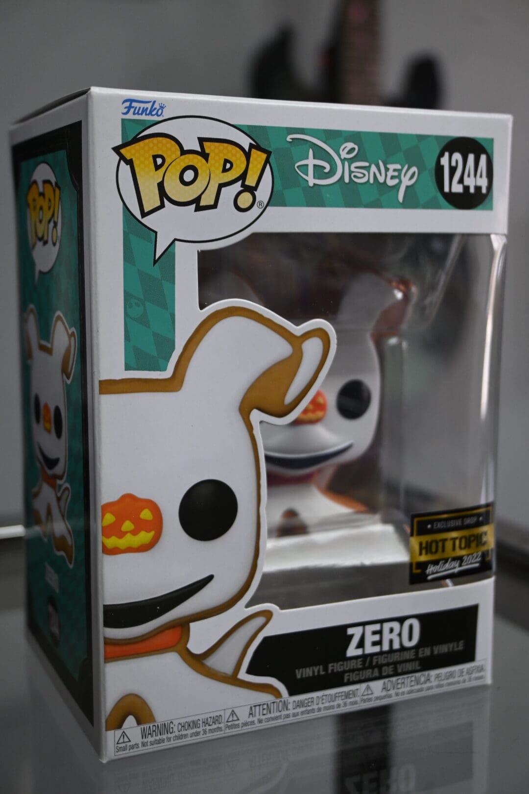 This holiday-themed version of Zero, Jack Skellington’s loyal ghost pup from The Nightmare Before Christmas, features warm cookie-brown outlines and a glowing pumpkin nose styled in festive colors. It pairs perfectly with the matching Sally and Oogie Boogie variants from the same exclusive line.