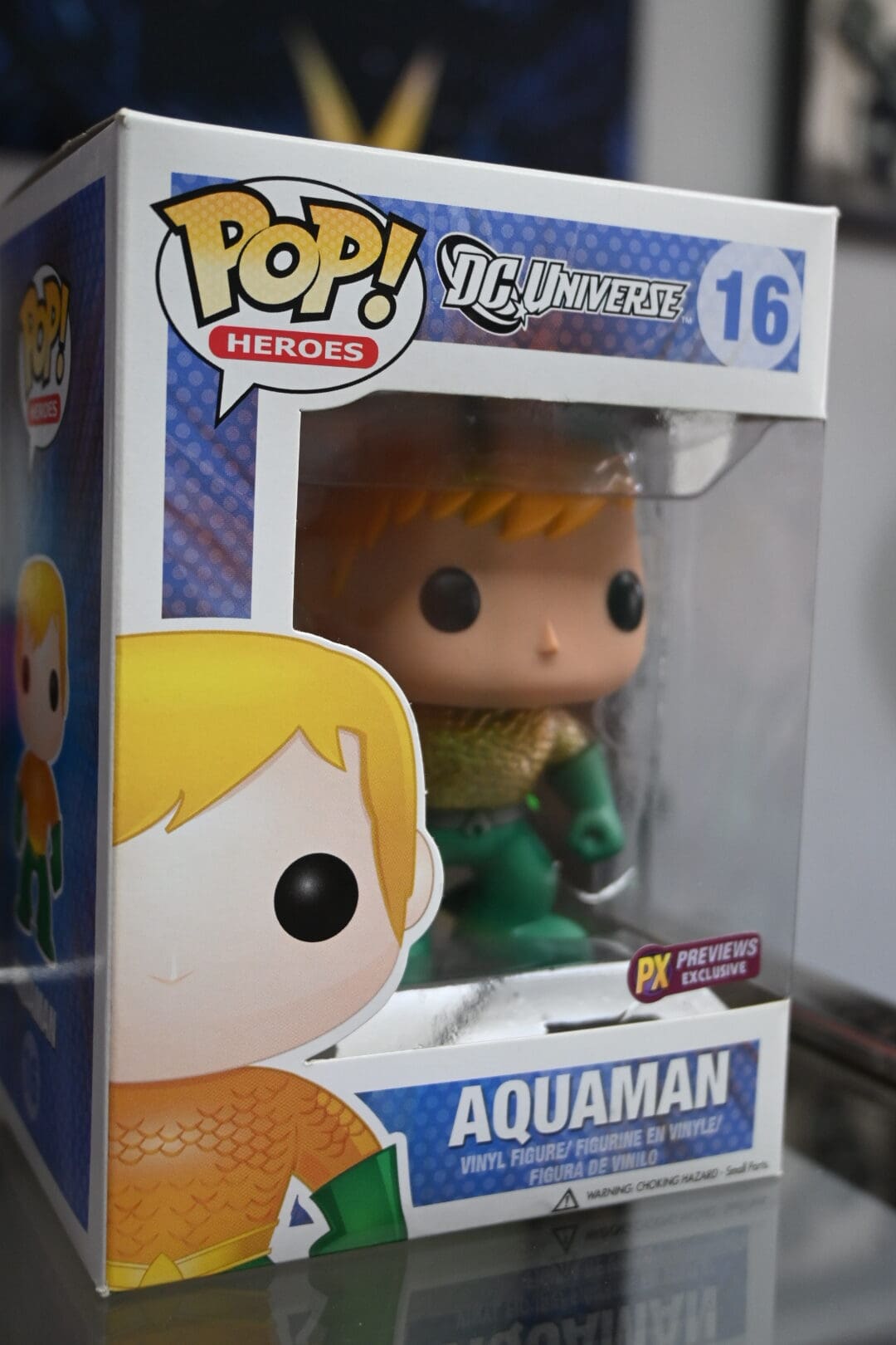 This early-run DC Universe Aquaman Pop captures the classic Silver Age design — bright orange scale armor, green gloves and boots, and golden-blonde hair. As a PX Previews Exclusive, this version stands out as a harder-to-find throwback collectible from Funko’s early DC wave.