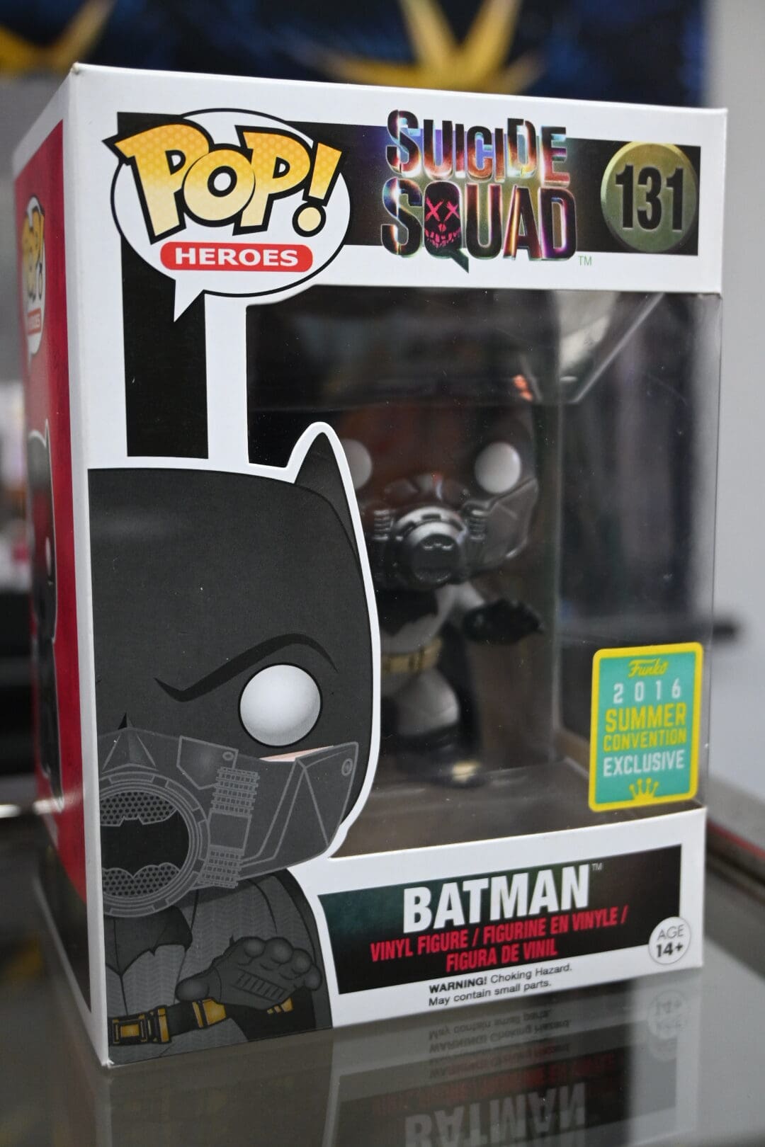 This 2016 Summer Convention Exclusive features Batman in his tactical gray suit from Suicide Squad, complete with armored detailing, black cowl, and gold accents on the utility belt and gauntlets. The darker, grittier design fits perfectly with the Suicide Squad aesthetic and makes this variant stand out from standard Batman Pops.