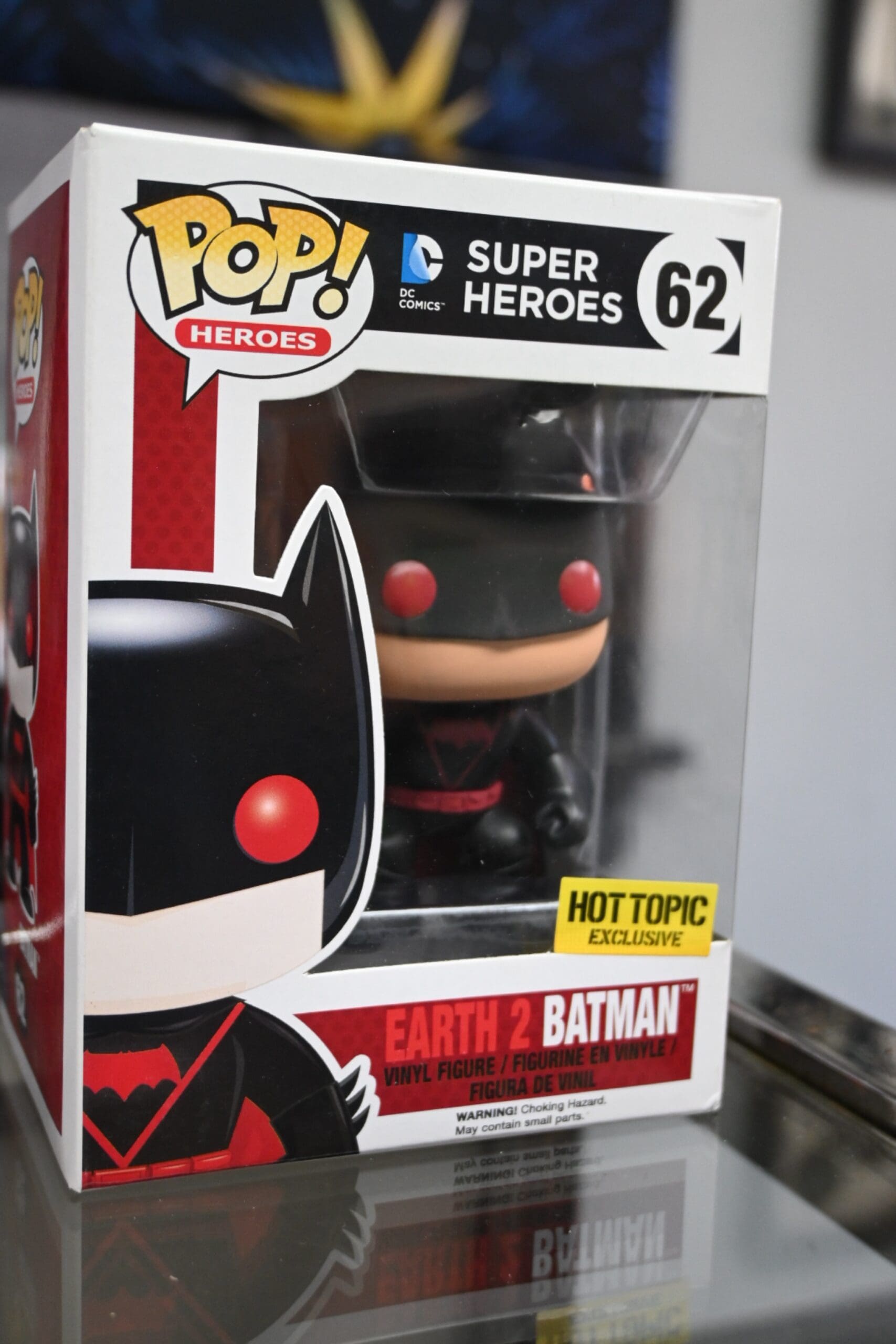 This Hot Topic Exclusive features the darker, more tactical Earth 2 Batman suit. With its black cowl, bold red accents, and menacing red eyes, this Pop captures Thomas Wayne’s ruthless version of the Dark Knight from DC’s Earth 2 storyline.