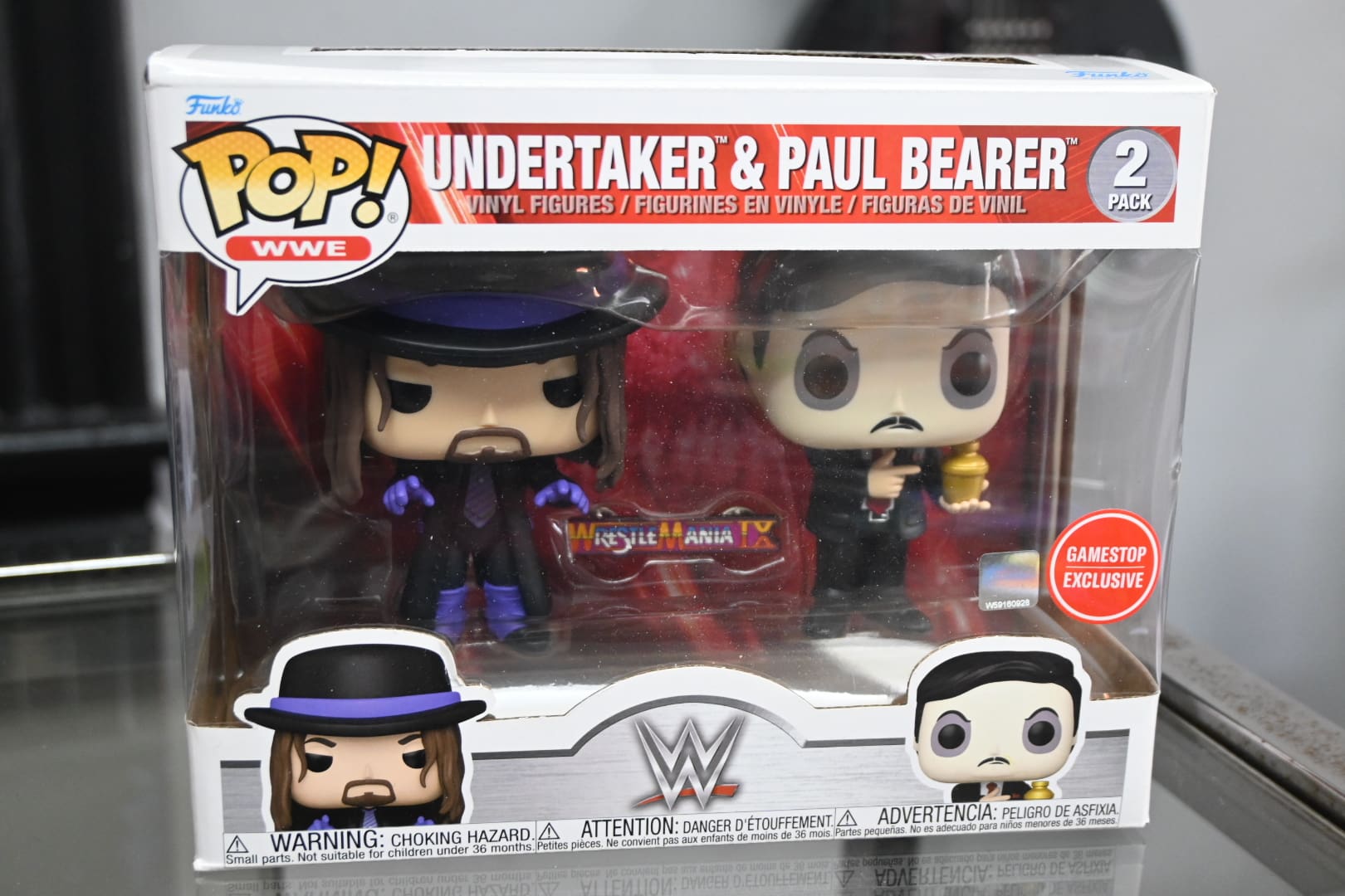 This iconic 2-pack features The Undertaker in his classic all-black and purple attire alongside Paul Bearer holding the legendary urn. A perfect recreation of their unforgettable presence from WWE history and the WrestleMania IX era.