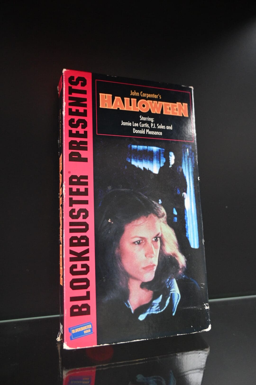 This is the Blockbuster Presents edition of John Carpenter’s Halloween, featuring Jamie Lee Curtis, P.J. Soles, and Donald Pleasence. A nostalgic collectible straight from the golden age of video rental, showcasing the iconic cover art and classic late-90s Blockbuster branding.